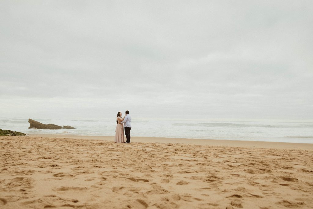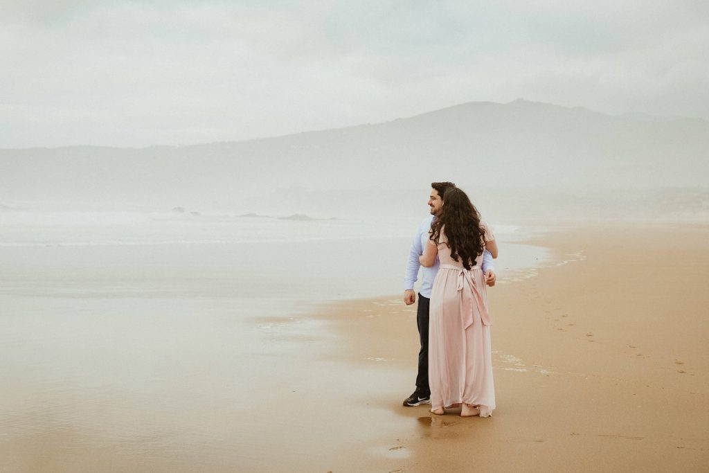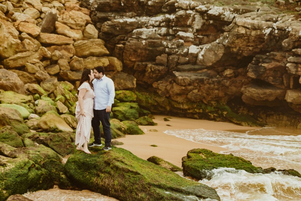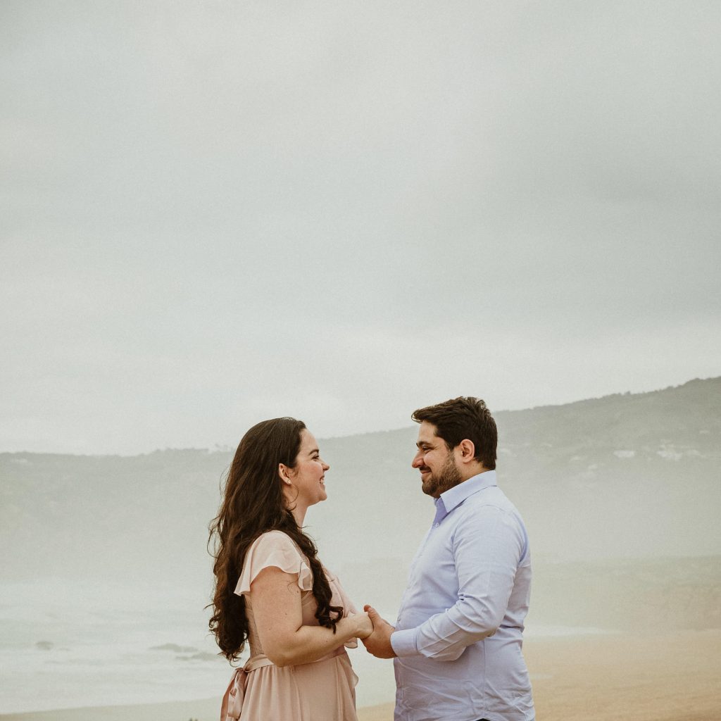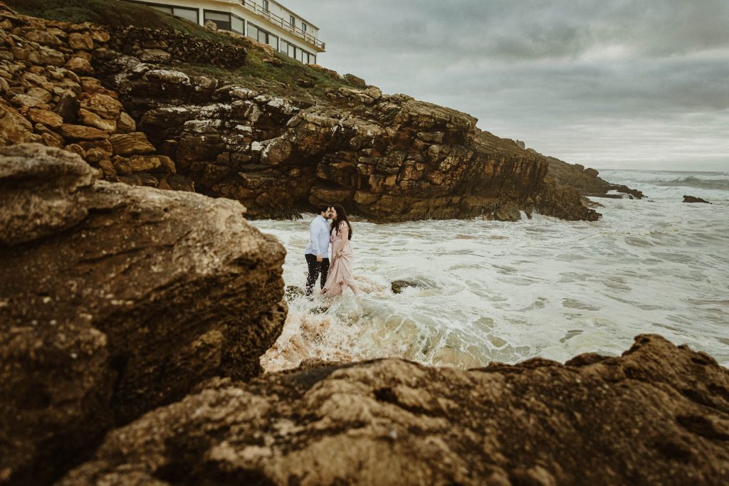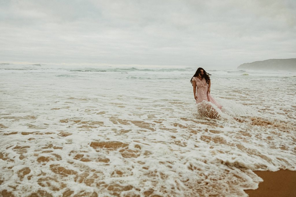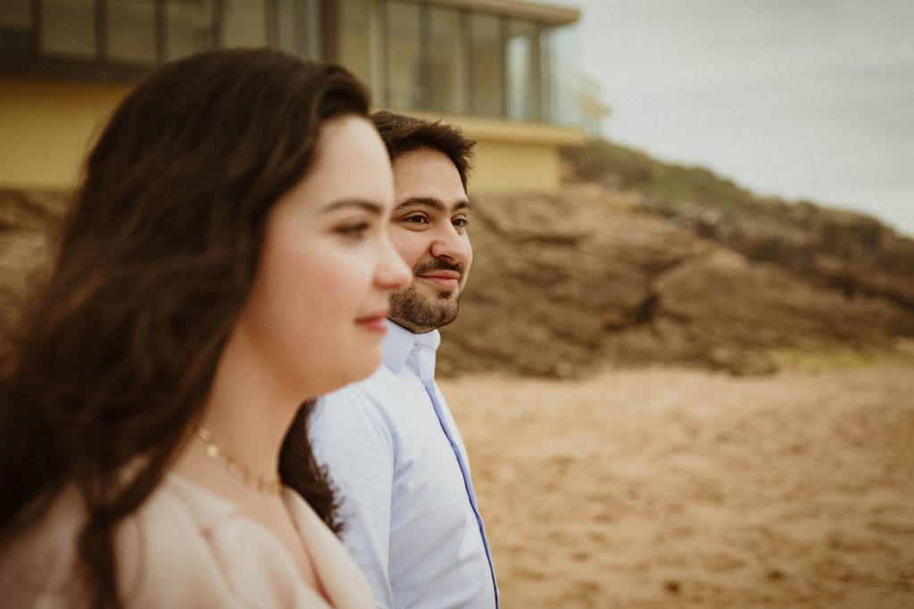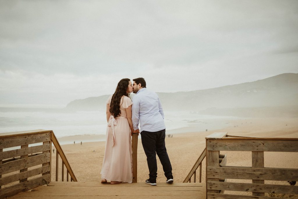 Uma sessão na praia, a ver o mar, com os pés na areia e uma maré cheia.