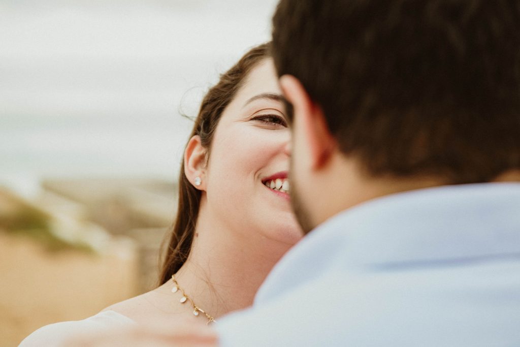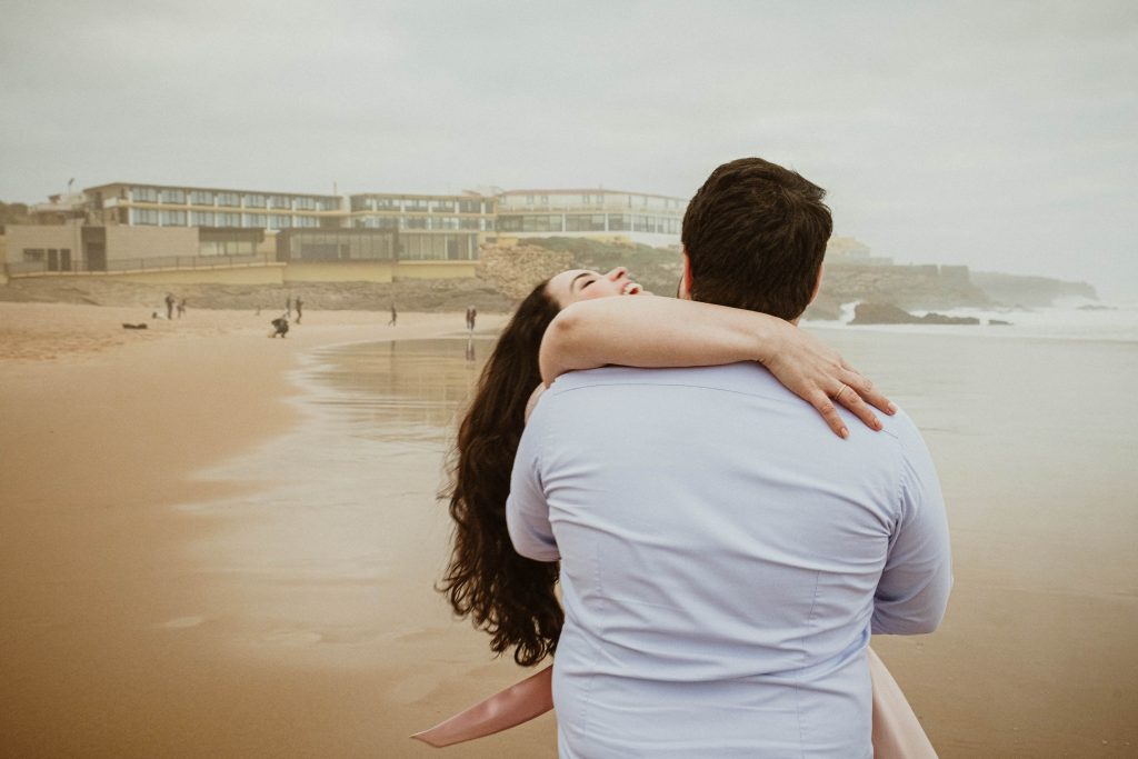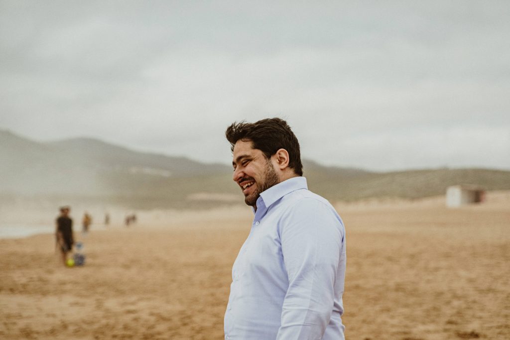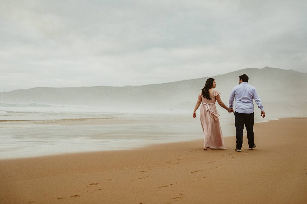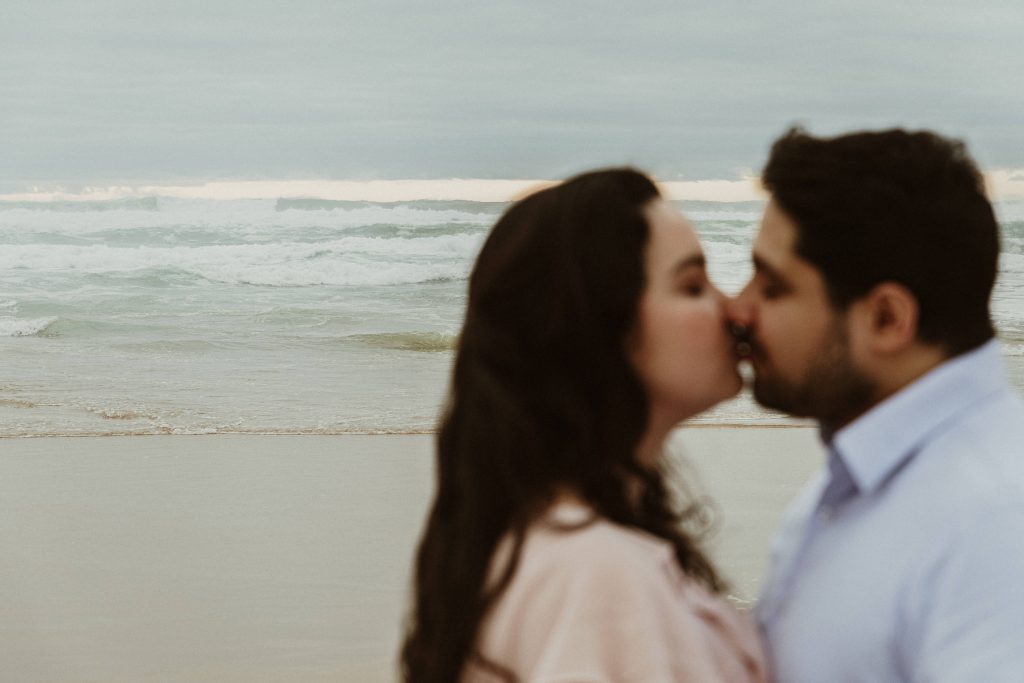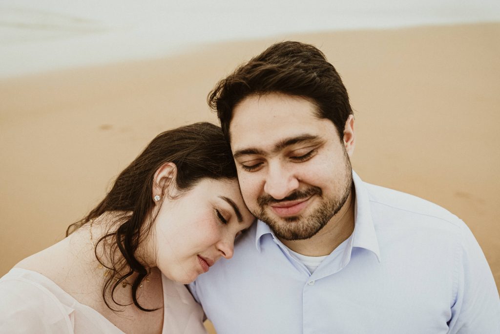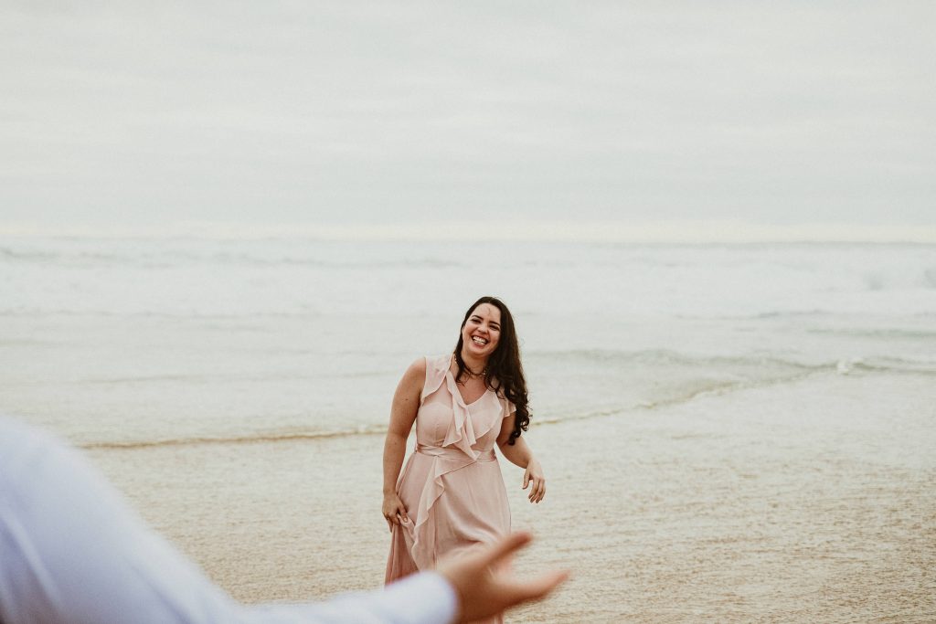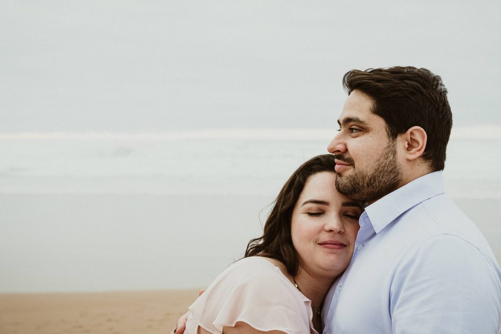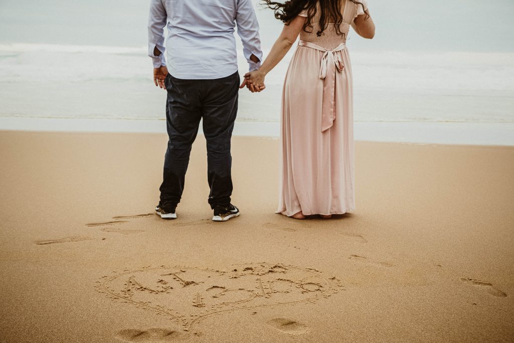 Uma sessão na praia, a ver o mar, com os pés na areia e uma maré cheia.