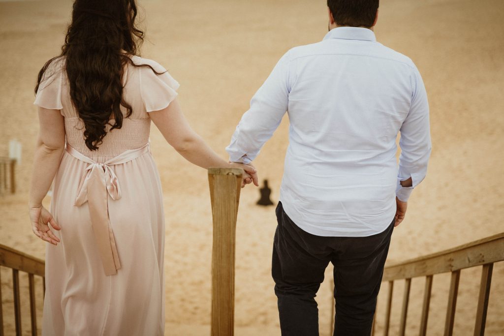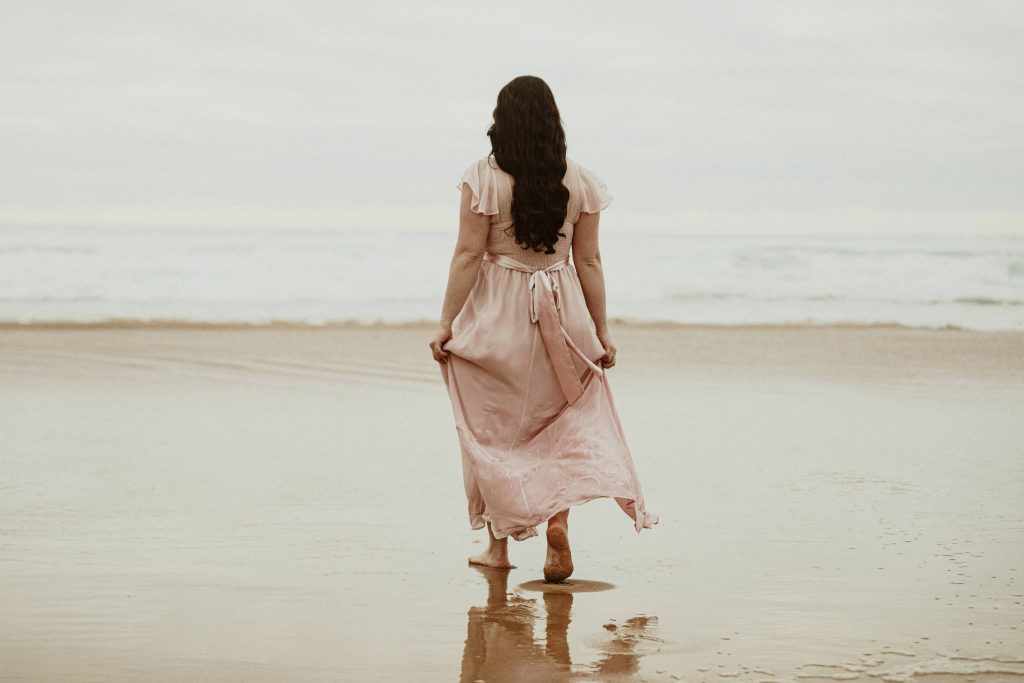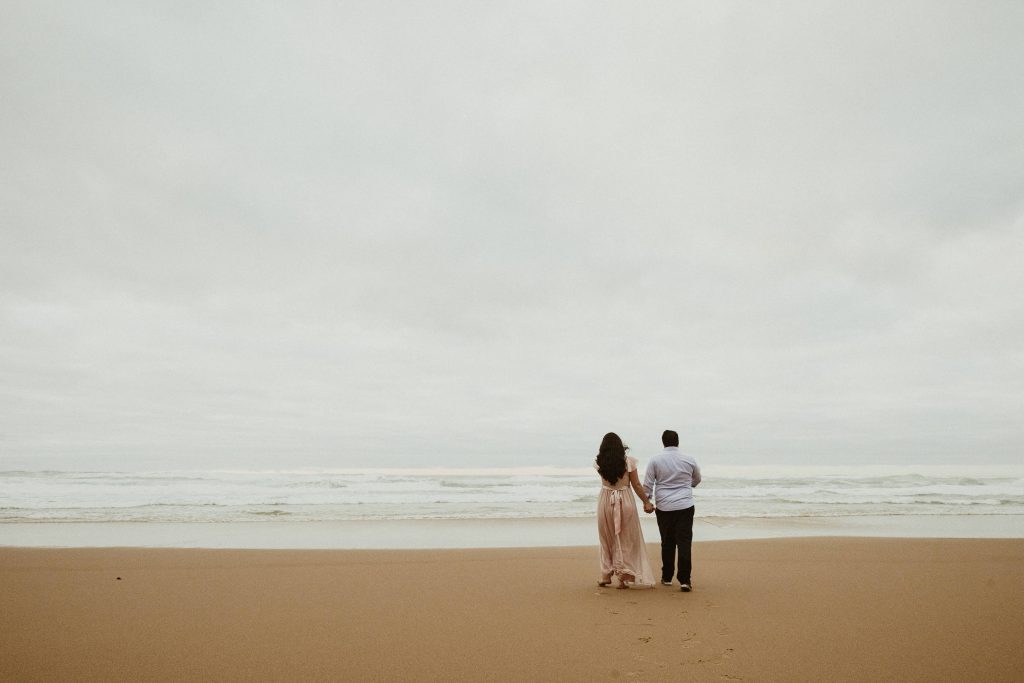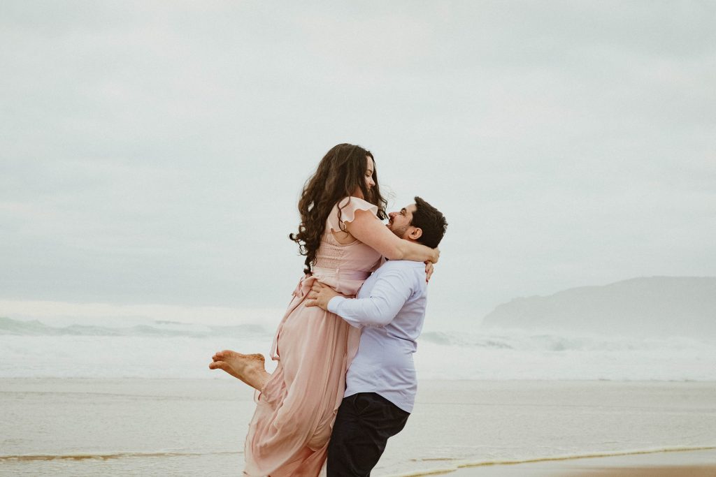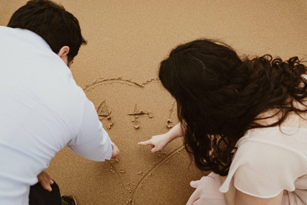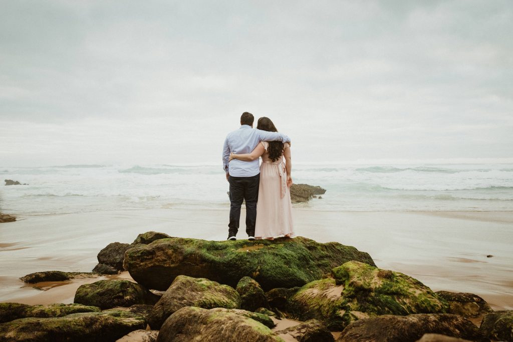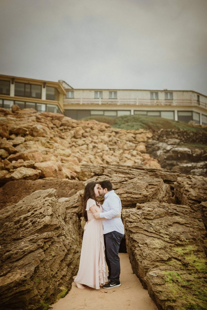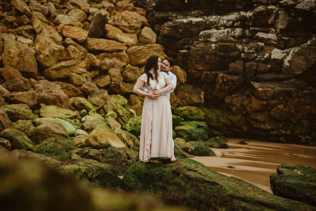 Uma sessão na praia, a ver o mar, com os pés na areia e uma maré cheia.